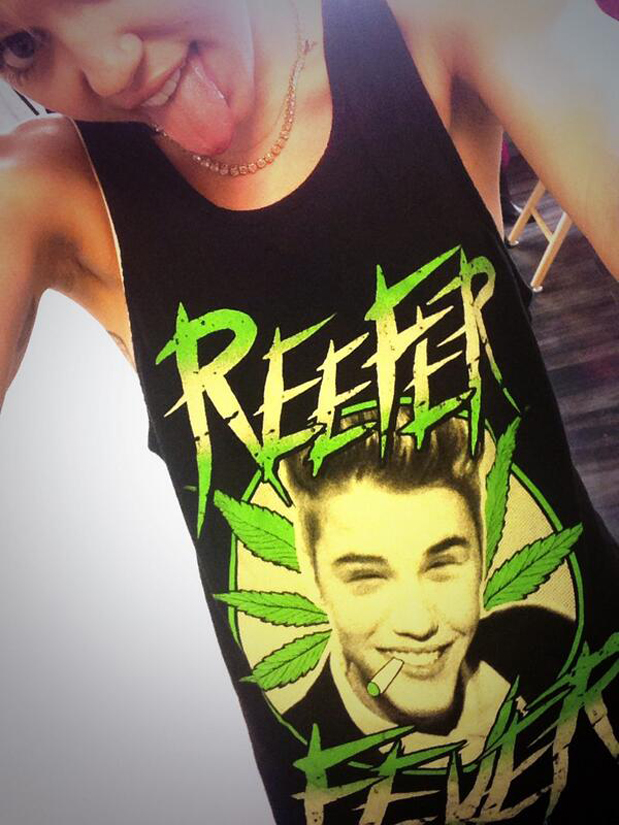 Here's a surprising confluence: Miley Cyrus, tongue dangling of course, wearing a black t-shirt featuring a photo of Justin Bieber with a cartoon joint hanging out of his mouth and the words "Reefer Fever" on it. The Boston-based metal band Ice Nine Kills sells the shirt for $15.