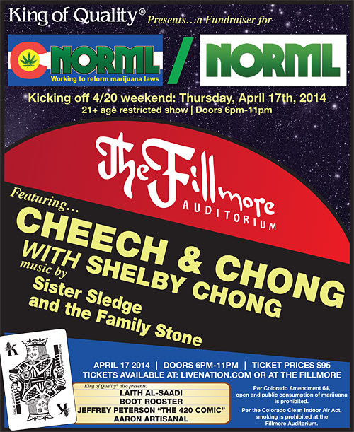 What: The classic stoner comedy duo kick off the week's festivities with at concert at one of Denver's biggest and best music venues. Tommy Chong's wife Shelby is also part of the show, which also includes entertainment from Suster Sledge, the Family Stone, Boot Rooster, Laith Al-Saadi, Aaron Artisanal and Jeff Peterson (a.k.a. The 420 Comic). This is a fundraiser for Colorado NORML and NORML.