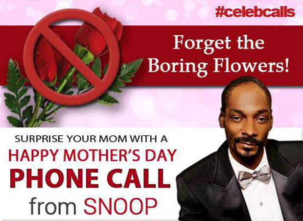 You can have Snoop Dogg, Justin Bieber, Charlie Sheen or 40 other celebrities ring up your mom today using Celeb Calls. Even better, Snoop can send you a "smoke invite" that references the Real Purple. "You smell me?" he asks. The calls costs $4 each.