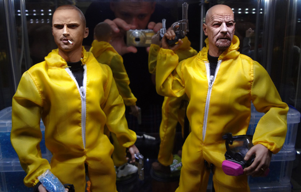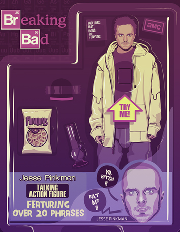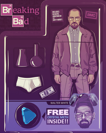 Two of the show's characters are depicted wearing Hazmat suits with crystal blue meth, gas masks and guns as accessories. In Breaking Bad, Walt White (Bryan Cranston) and Jesse Pinkman (Aaron Paul) make a fortune cooking and selling the drug.
