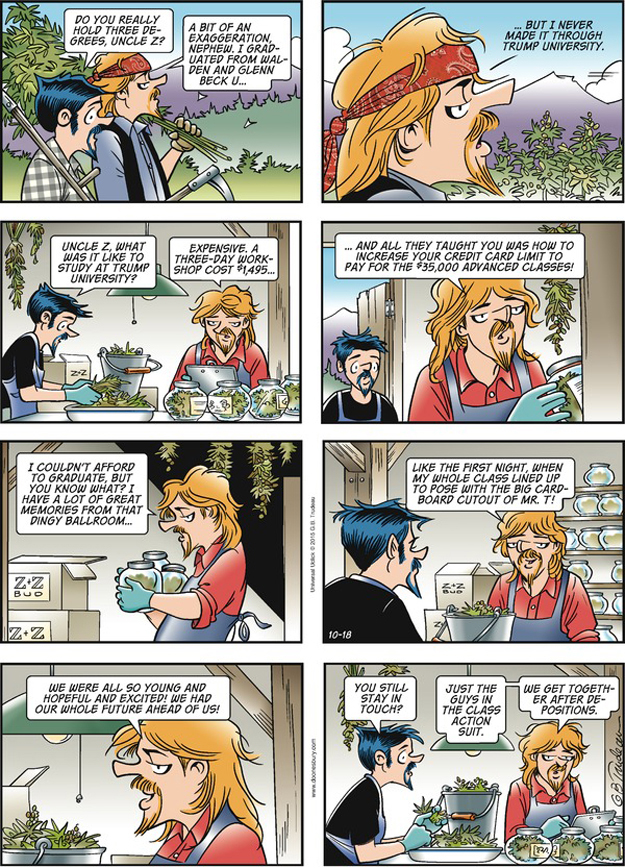 Zonker has kept his promise and is growing marijuana in Colorado. In Garry Trudeau's latest Sunday Doonesbury comic strip, Zonker tells his nephew Zipper about when he attended Trump U. as they trim and jar their outdoor pot crop.