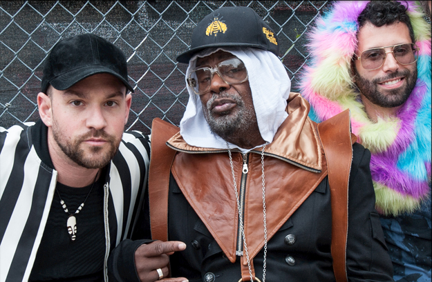 George Clinton surrounded by Charlie Levine (left) and Eli Goldstein of Soul Clap in Brooklyn, NY. Photo by Cheyenne Bosco