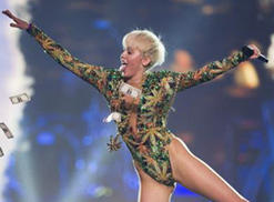 Miley Cyrus opened her latest tour last night in Vancouver. Among the many outfits and stage props was a custom-made leotard dotted with pot leaves.