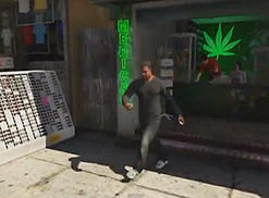 Grand Theft Auto character Franklin visits a California marijuana dispensary in the upcoming fifth volume of the popular video game. He's seen here outside the store holding a beverage.