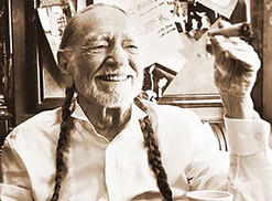 Willie Nelson posed for this photo in his tour bus holding a large cannabis stogie. He added some words about "drinking a little whiskey or smoking whatever works for us."