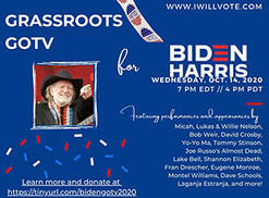 Willie Nelson headlined Joe Biden's virtual fundraiser on October 14. Also on the bill were: Nelson's sons Lukas and Micah, Bob Weir, Beto O'Rourke, David Crosby, Montel Williams, Joe Russo's Almost Dead, Yo-Yo Ma, Shannon Elisabeth, Lake Bell and more.