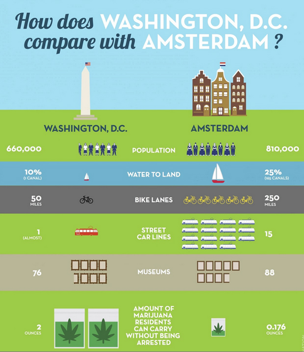 The infographic below, created by the Dutch Embassy, compares DC and Amsterdam. What's missing is the number of coffee shops in Amsterdam (approximately 280). There are none so far in the Nation's Capitol. If Eidinger has his way, that will soon change.