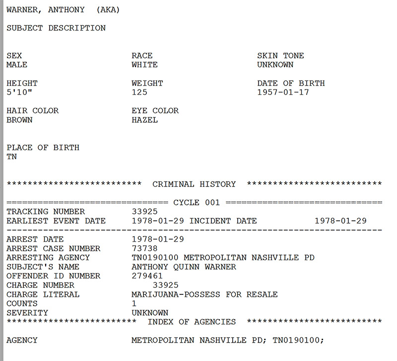 On January 29, 1978, Warner was arrested on a "marijuana possession for resale" felony charge in Nashville (see police record below). He'd just turned 21. The case was resolved with a guilty plea on November 8, 1979. Criminal court records show Warner was sentenced to one year in jail and also was given two years probation. It's unclear how much time he spent in jail.